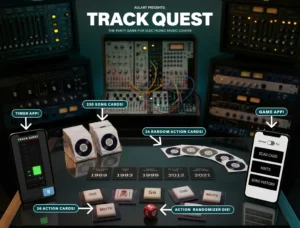 Track Quest explores more than 60 years of electronic music history, beginning in the 1970s, when disco and krautrock helped shape the genre’s rhythmic identity and experimental direction. The gameplay challenges participants to arrange tracks in chronological order using short audio clips and helpful hint cards. Players can disrupt each other’s progress by blocking hints, stealing cards or activating countdown timers, keeping each round dynamic and unpredictable.